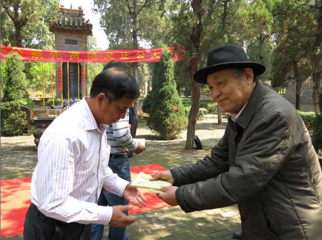 中国范仲淹研究会文史委员会副主任、世界范氏宗亲联谊会创始人·顾问委员会主任、洛阳范仲淹研究会副会长兼秘书长范章(文正公28世)向广东范氏宗亲每人赠送一本《范仲淹新传》,伊川范氏宗亲联谊会副会长兼秘书长范校伟(文正公30世)向广东宗亲赠送《高山仰止》一书。范炎威会长在范园题词“寻根问祖几千年,世道无情勤搬迁,范氏文化永耀!”范桃宗亲代表广东寻根拜祖团捐赠人民币800元。