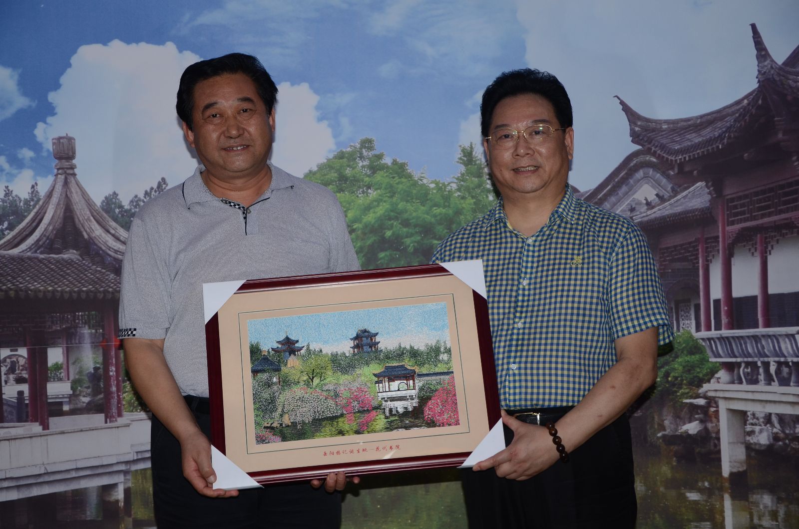本网讯 7月22日,佛教界大护法、文正公二十六世香港范梅艳居士、北京大学历史文化研究所常务所长、教授、中国范仲淹研究会会长范国强先生一行从伊川驱车前往邓州市。范梅艳大护法祖居邓州,此行主要是寻访先祖文正公当年知邓州创建并写下千古名篇《岳阳楼记》之地——花洲书院。河南省范仲淹文化研究会执行会长、原邓州市政协主席杨德堂先生等陪同范梅艳大护法、范国强教授参观了春风阁、春风堂、景范亭、范公祠、范仲淹纪念馆、先圣殿、碑廊等胜迹,范梅艳大护法、范国强教授在文正公像前行祭拜礼,范梅艳大护法表示将为花洲书院捐建范文正公像。在春风堂,范梅艳大护法穿上古装,坐在书桌前,遥思先祖文正公当年创作《岳阳楼记》抒发“先天下之忧而忧,后天下之乐而乐”崇高思想的情景。邓州市委常委、宣传部部长陈达、河南省范仲淹研究会执行会长杨德堂分别向范梅艳大护法、范国强教授赠送花洲书院绣品和《范仲淹研究》。