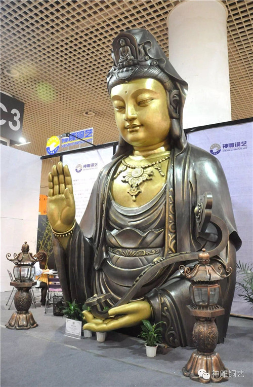 4月21日-25日,由佛教界护法善信李绪峰居士、范梅艳居士、李骐亨居士法眷属合家供养寒山寺9.9米高如意观音铜像在2016年厦门春季国际佛事用品展中展出,深获各地法师大德及各界信众居士的一致好评和赞叹。此观音圣像制作过程中经由中国美院陈长庚教授与中国传统工艺大师陈金泉老师亲自指导,范梅艳居士也亲自多次不断的调整修改,力求达到圣像完美、圆满。做为此次展会中最大的佛像,厦门卫视也对此观音圣像做了特别