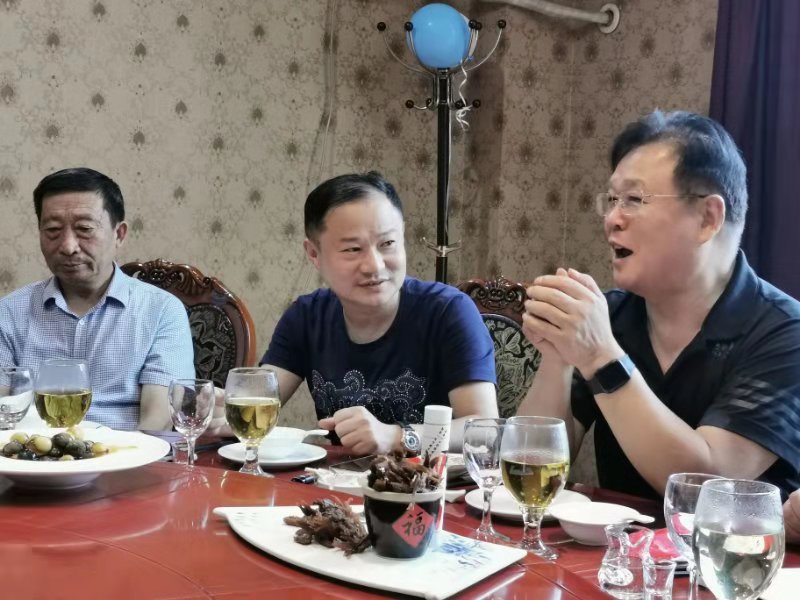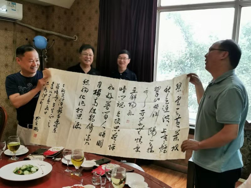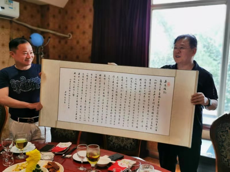 世范会副会长、河南范氏宗亲会会长、河南伊龙集团董事长范振国在伊龙国际大酒店设午宴盛情招待范培顺会长一行。杨关桥部长向安徽省范氏宗亲会赠送书法作品《苏幕遮·怀旧》,范振国会长向安徽省范氏宗亲会赠送人民日报社原总编辑范敬宜书法作品《岳阳楼记》