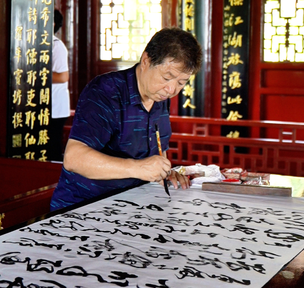 此次范克斌专程赶来岳阳,将长66米的大型书法长卷《千古名楼》捐赠于岳阳楼景区收藏。范克斌历时多年创作的草书长卷《千古名楼》共分为7个篇章,包括《岳阳楼记》、《滕王阁序》、《黄鹤楼》、《登鹳雀楼》、《登飞云楼》、《秋风楼》和提跋。该作品一气呵成,格调高雅,笔法灵动,风格雄浑,一经展示就吸引了许多市民游客的关注。“好大气的长卷,中国四大名楼都收录在里面呢……”周末的岳阳楼下,游客众多。许多人驻足停留,欣赏着这幅作品,不时拿出手机拍摄。