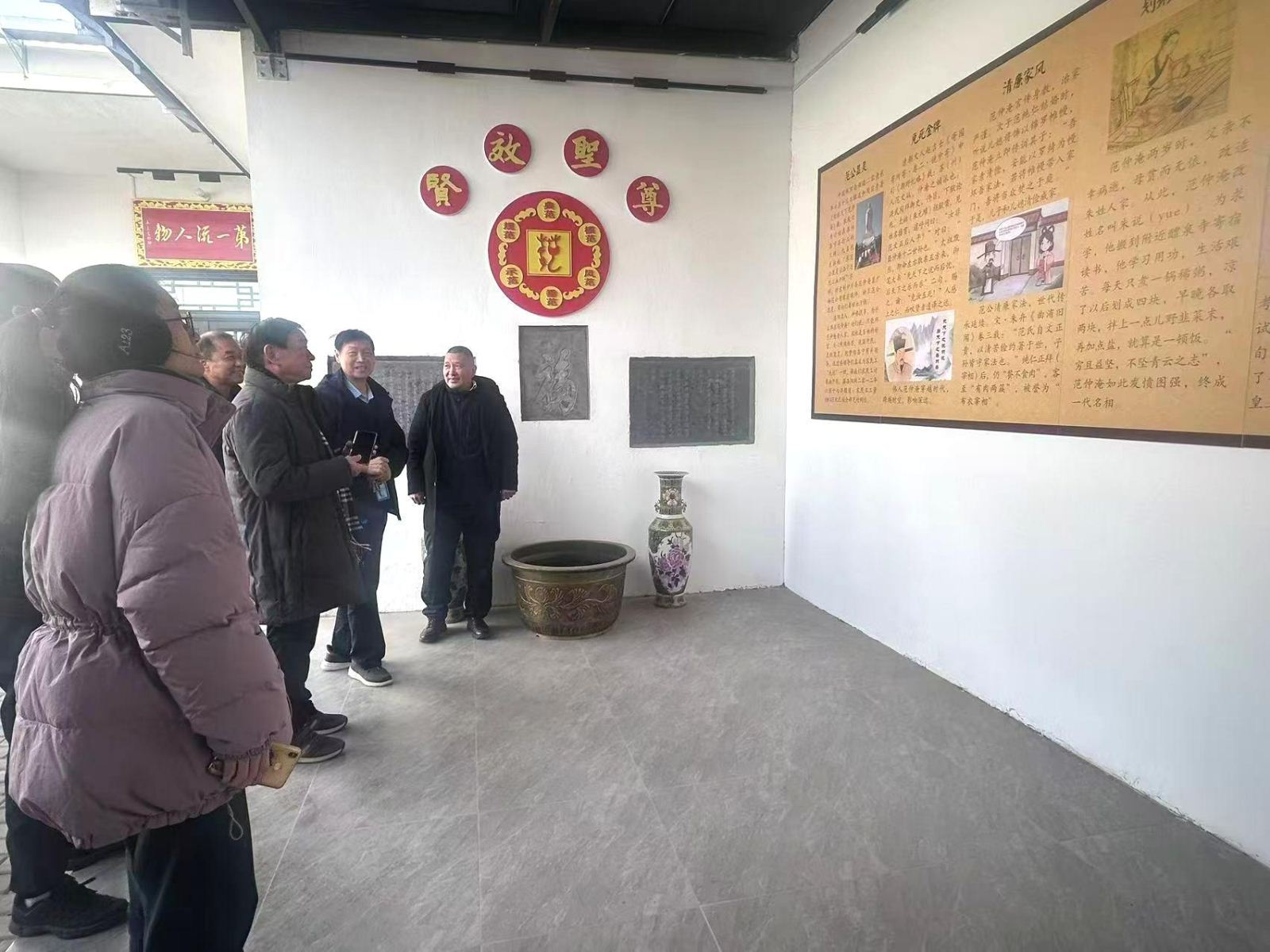 12月13日,“国家公祭日”, 县关工委副主任、县老干部服务中心主任、党支部书记靳瑞哲,县委组织部三级主任科员王社民、县关工委办公室副主任张灵社、县教体局关工委执行主任王甫伟、县老年大学关工委执行主任刘银汉等在范氏家风传承馆聆听范霞通介绍范仲淹“少年立志”、“划粥断齑”、“廉洁家风”等故事,学习革命烈士范敬玺和抗日老战士范钦的英雄事迹。